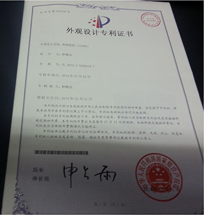 2015年9月,熱烈祝賀立樂熱熔膠機已領取LG08H熱熔膠機外觀專利證書 專利號:ZL 2014 3 0249214.3