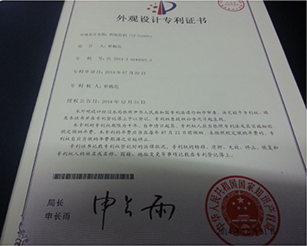 2015年9月,熱烈祝賀立樂熱熔膠機已領取LG06VP/LP06V熱熔膠機外觀專利證書,專利號:ZL 2014 3 0249327.3